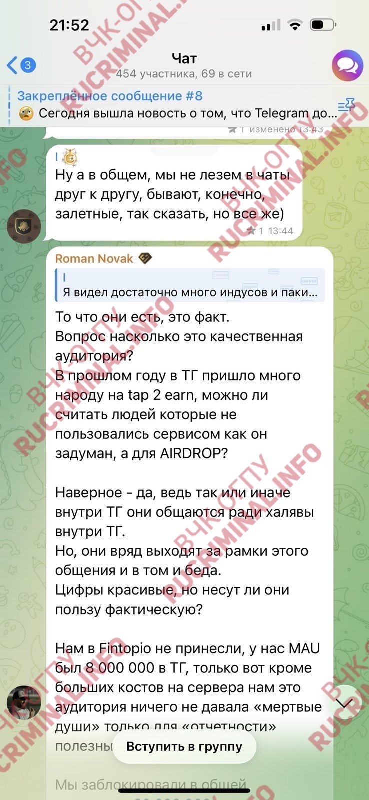 Примечательно, что в чате Fintopio все эти резкие сообщения от Романа Новака были зачищены. Их можно найти в боте, который специализируется на парсинге сообщений из публичных чатов Telegram.