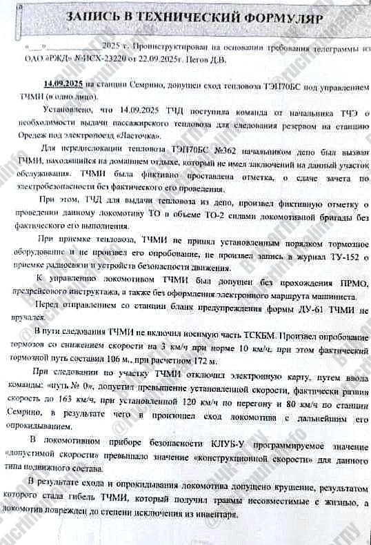 В распоряжении ВЧК-ОГПУ оказался бланк нового документа, который теперь заполняют работники локомотивных бригад на железных дорогах. После крушения (https://t.me/rucriminalinfo/5376) тепловоза с рельсов в районе поселка Семрино (Ленинградская область) до сотрудников РЖД довели требования из телеграммы за подписью замдиректора госкорпорации Дмитрия Пегова о правилах технической эксплуатации. Теперь для всех распечатала памятка с напоминанием о ЧП и обязательное заполнение технического формуляра.