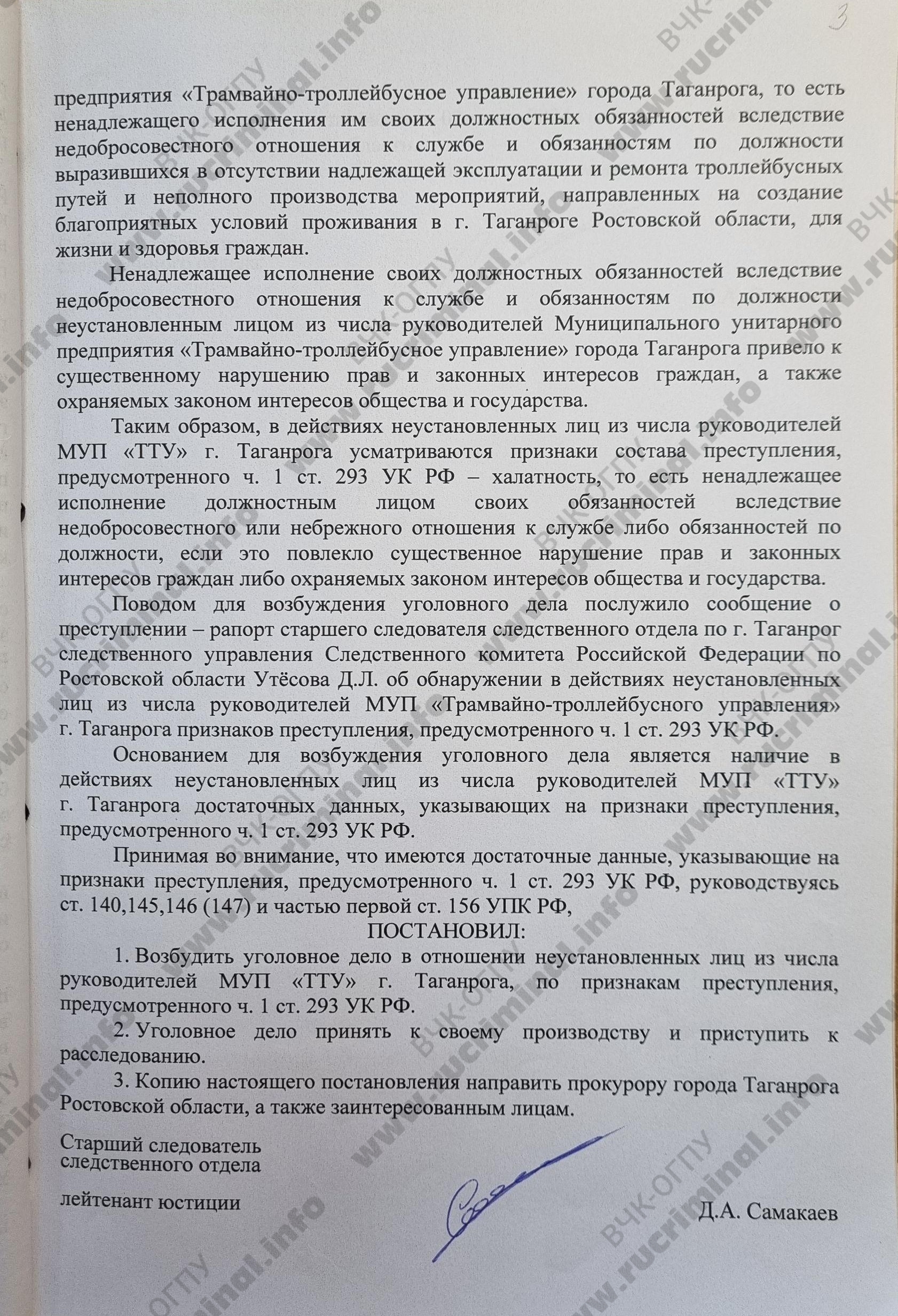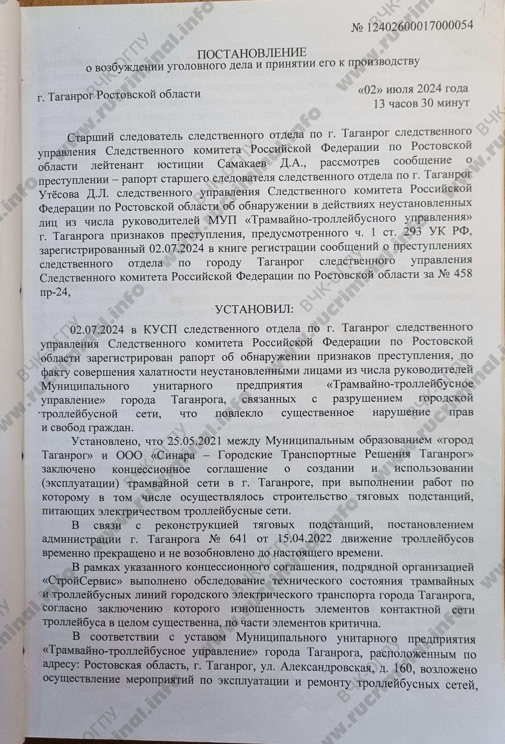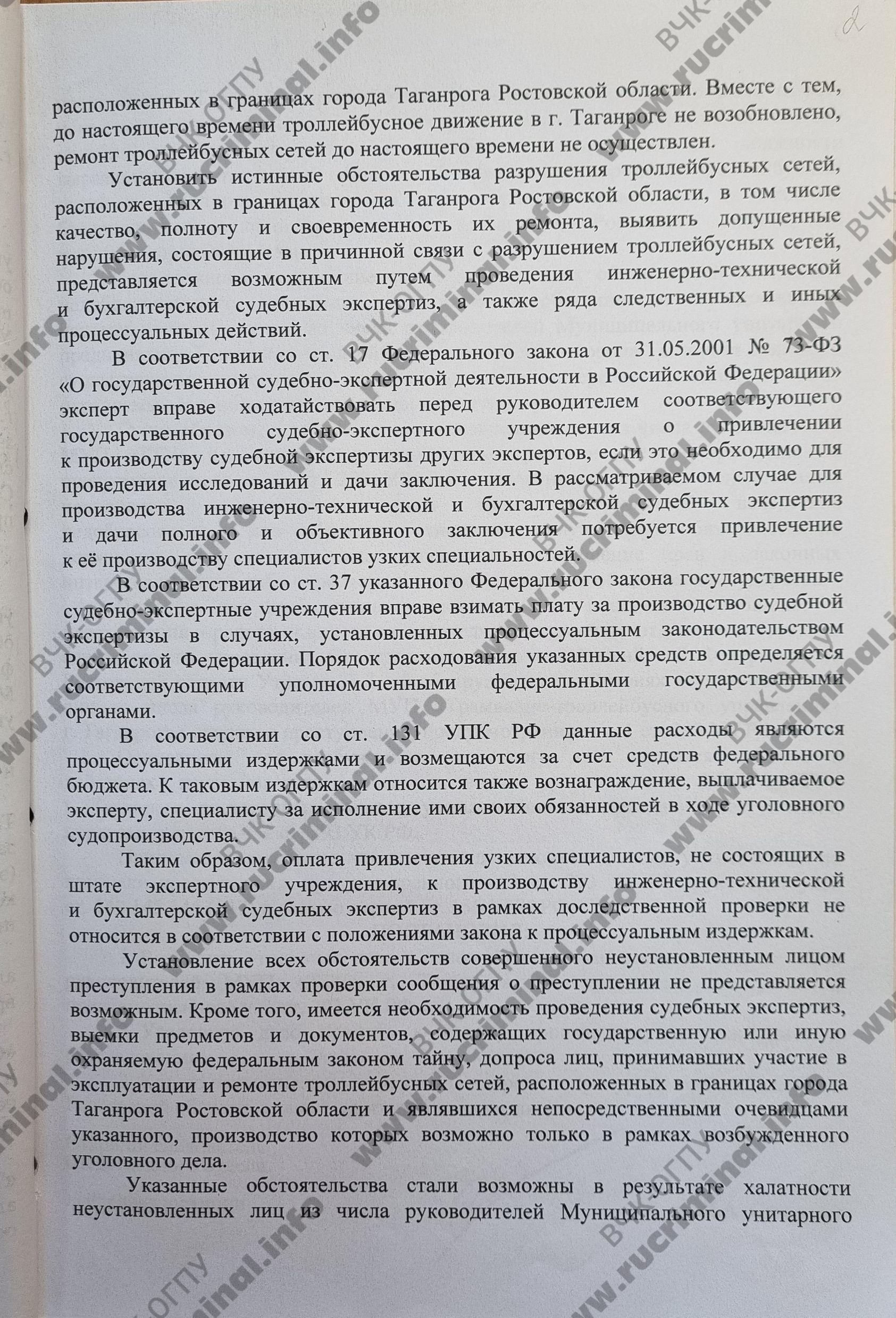 Также был выявлен еще один поддельный документ. В 2023 году чиновники администрации города Таганрога сделали «технический отчет от 03.06.2023 №1/КСТ». Выполнен он был от имени ООО “Стройсервис”. В этом отчете утверждалось, что все троллейбусные линии требуют замены. Однако, на допросе автора этого технического отчета заявил, что документ не изготавливал и не подписывал.