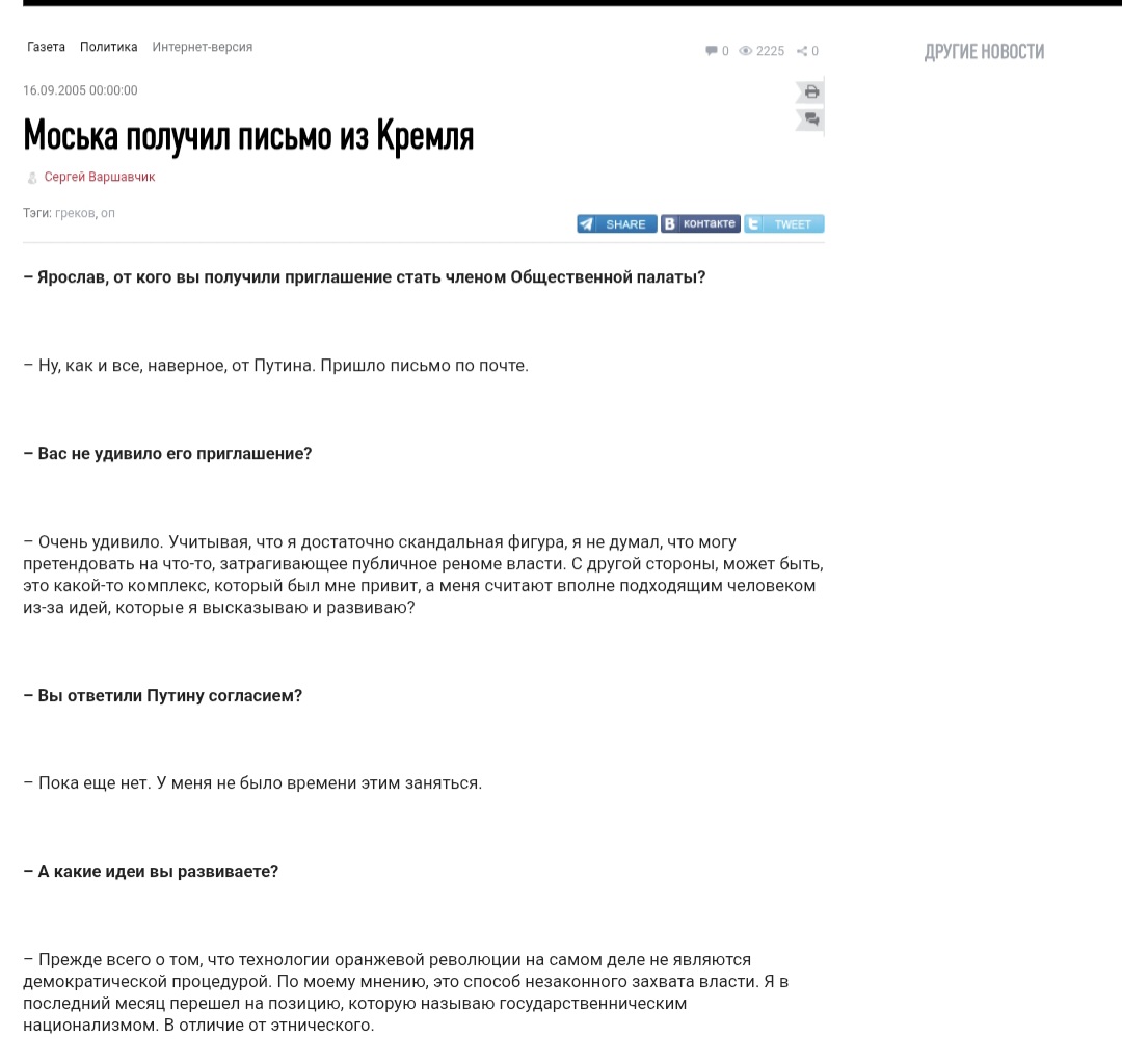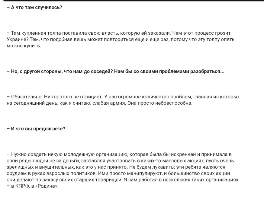 В этом же интервью он активно продвигал свои идеи по необходимости усиления российской армии и политической экспансии на соседние страны, в первую очередь Украину, где «купленная толпа поставила свою власть» (цитата Грекова).